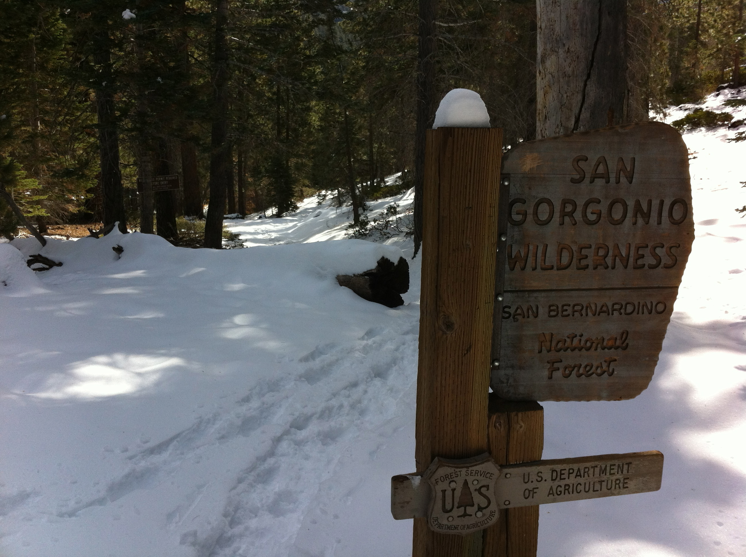 About two miles in we passed the trail to Poopout Hill and crossed into the San Gorgonio Wilderness. From there the snow began to deepen and the trail began to pick up altitude. As we continued we arrived at the trail split for Dry Lake. The footprints followed the Dry Lake trail, while we got a look at the