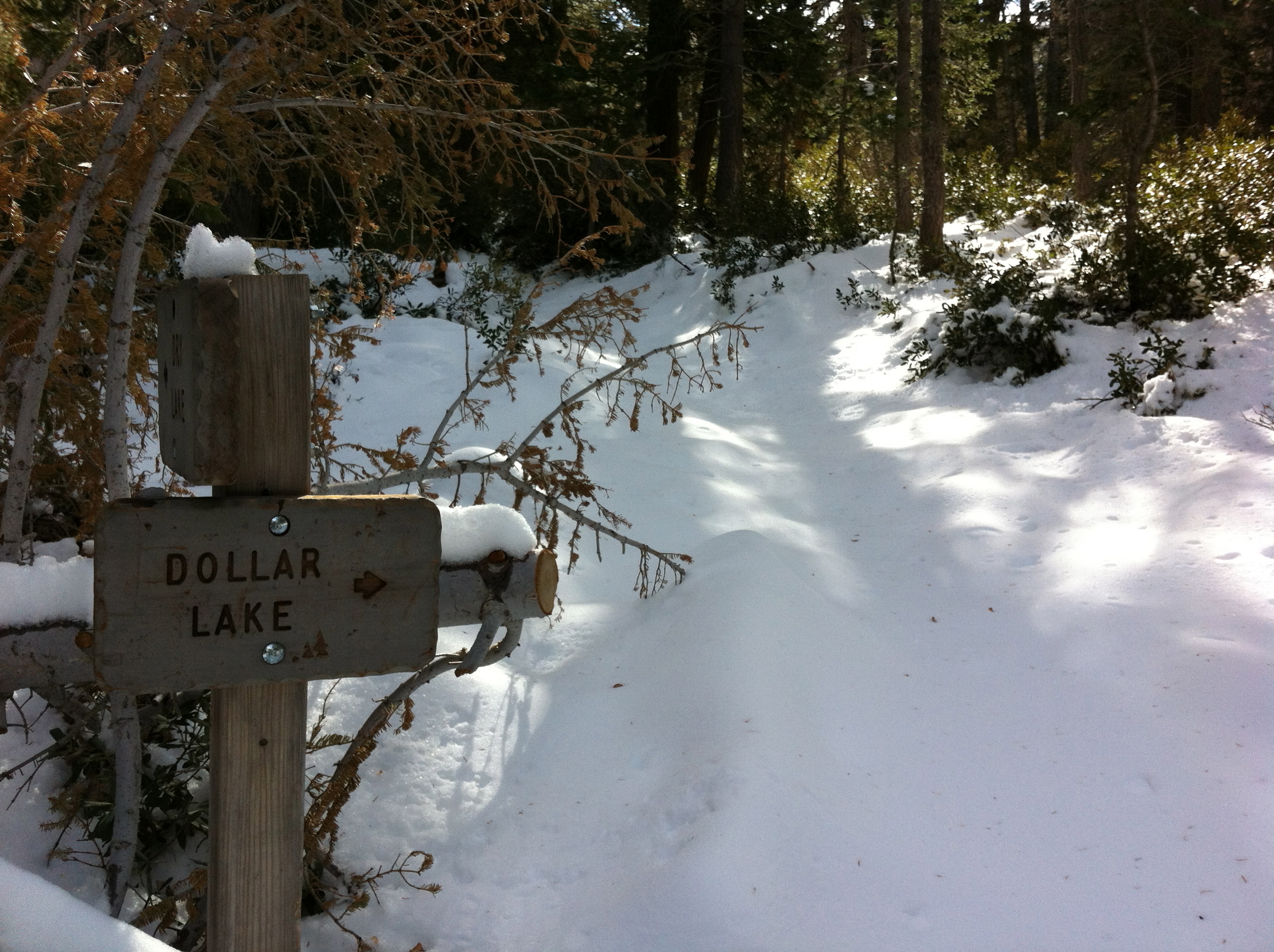 trackless trail coming from Dollar Lake that we would be returning on in a few days. This left me wondering how far the tracks continued along this trail. Did they go all the way to the top, or did they stop at the switchbacks where our guy from the trail blog had to turn back? The answer to this question would have to wait until tomorrow when we pushed for the summit. Until then, we continued to Dry Lake.
