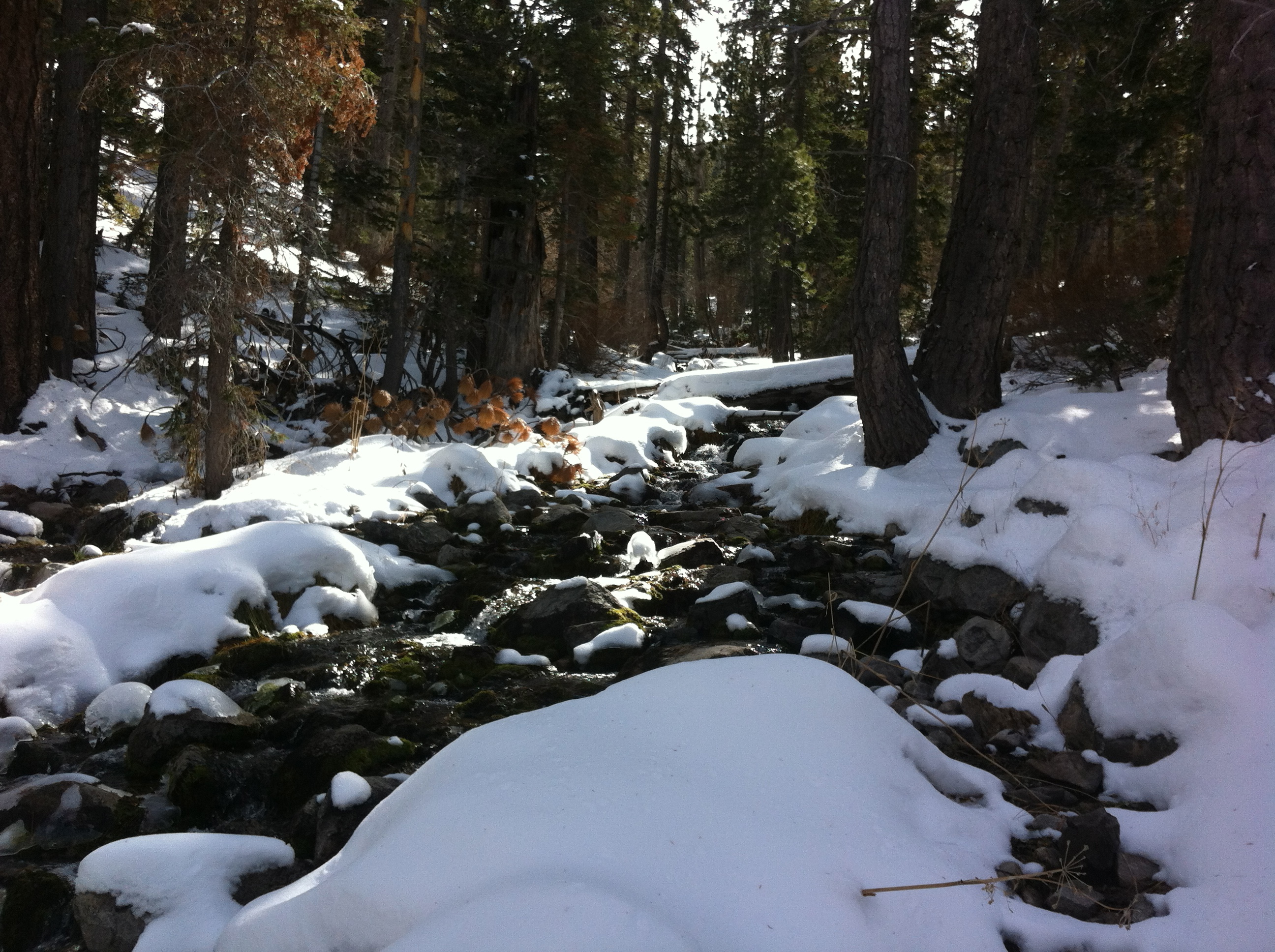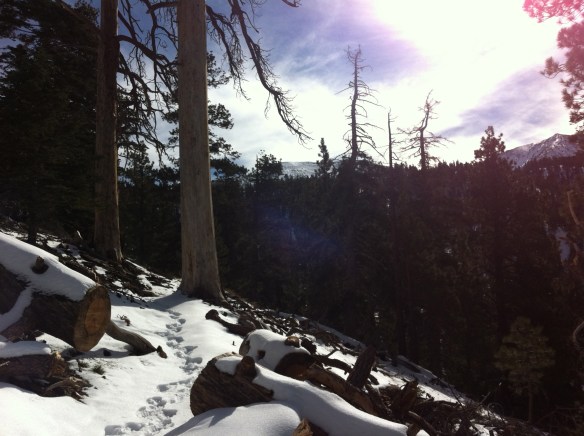 The South Fork Trail head starts at about 6,200 ft and there was snow on the trail from the start. It was patchy at first, but didn’t take long to become at steady layer on the trail. The trail was well traveled with several sets of tracks leading the way.