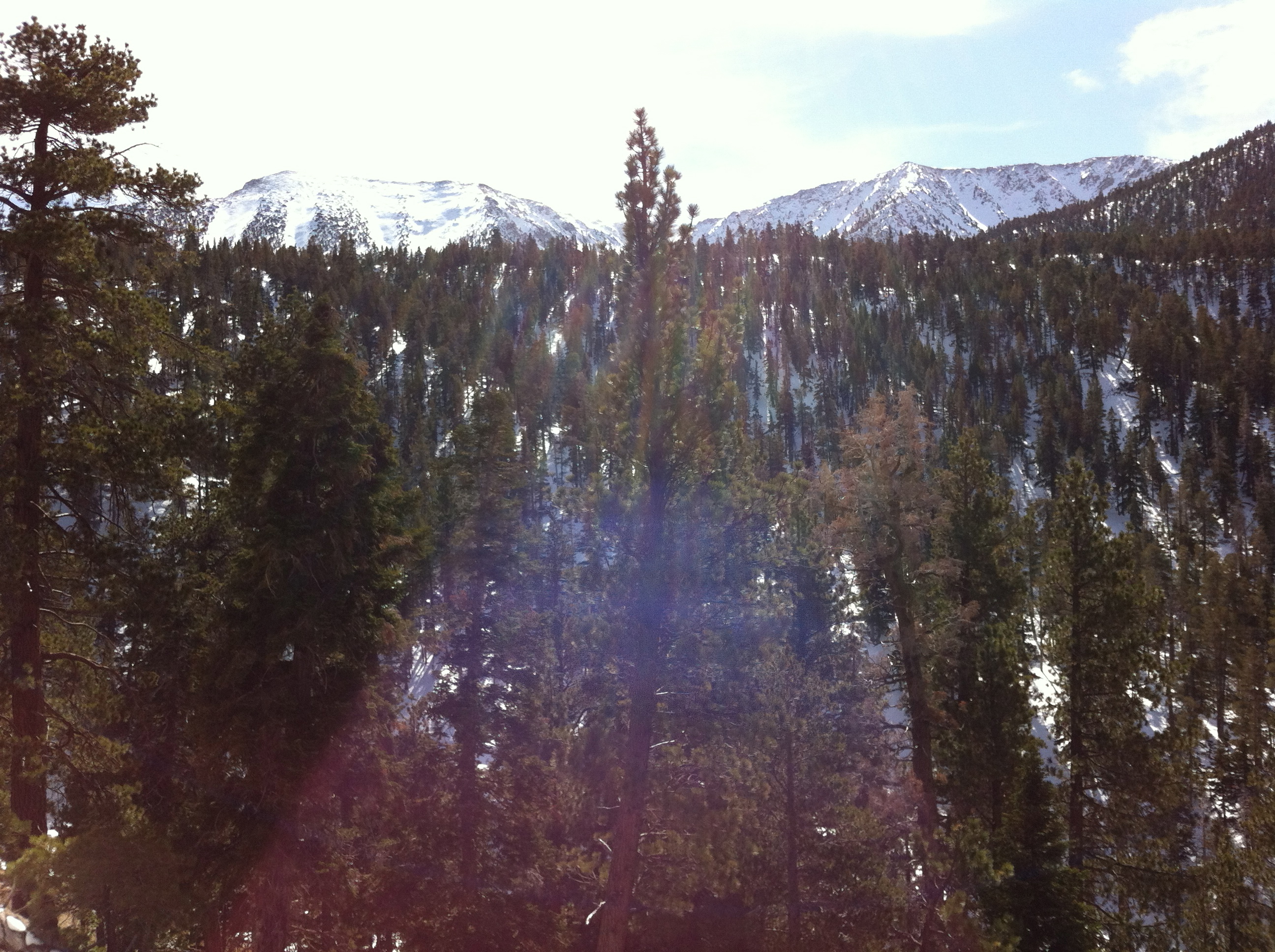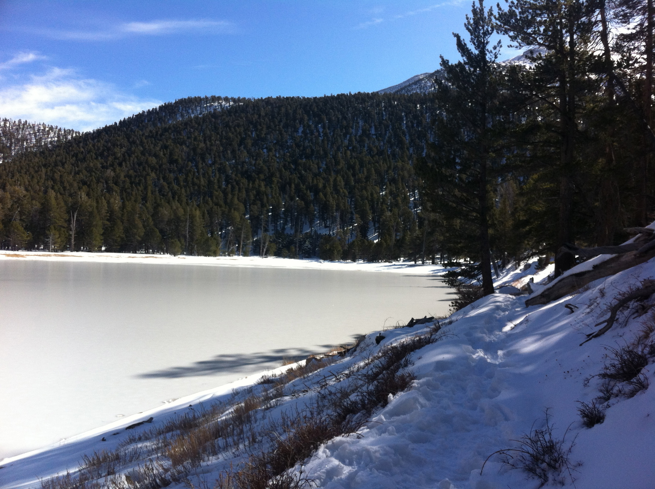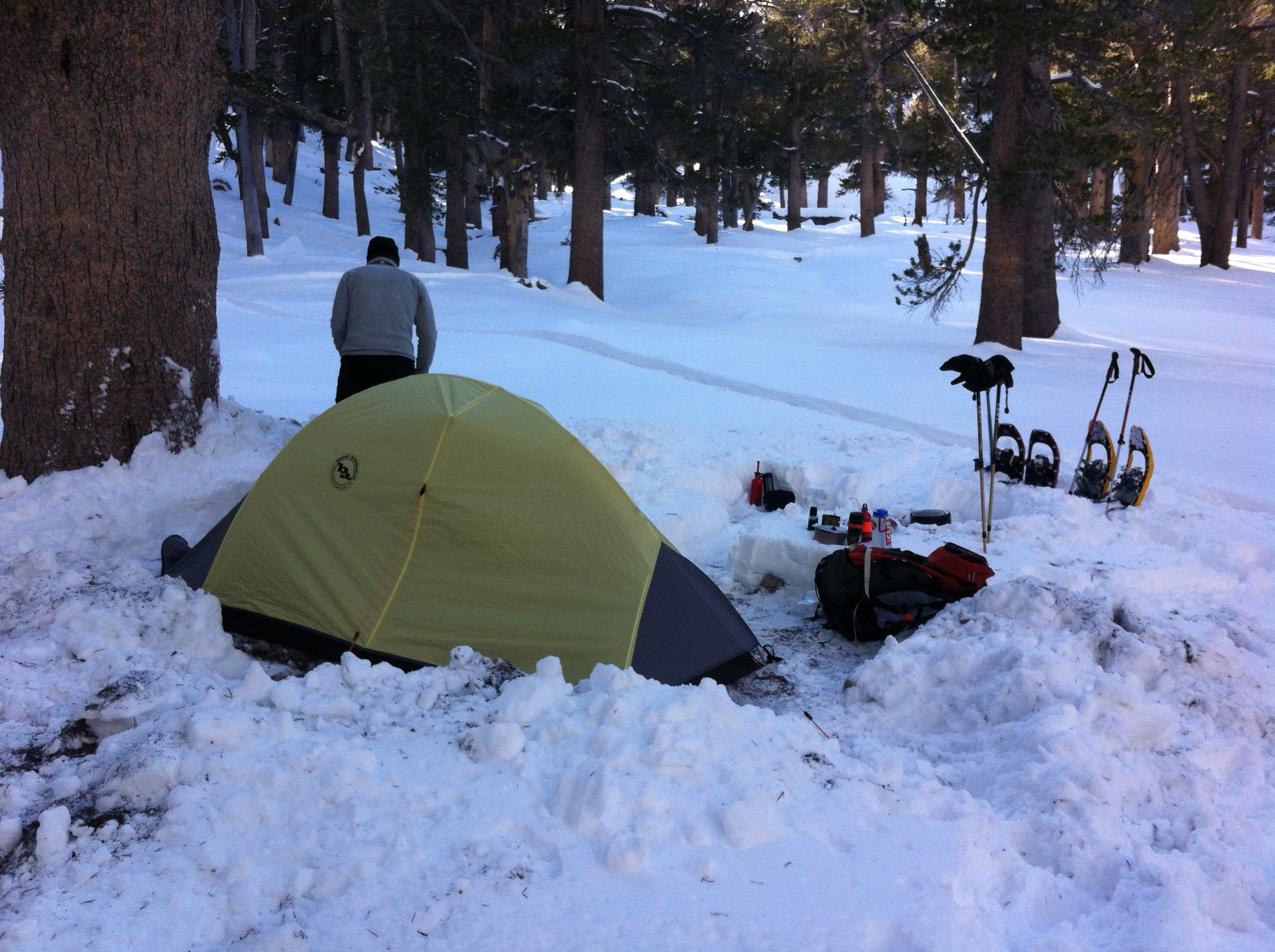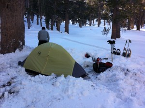 We arrived at Dry Lake to find it frozen over. The 3,000 ft we had gained since leaving the trailhead had brought cooler temperatures (mid 40’s in the sun) and deeper snow at our first camp at 9,000 ft. We put on our snow shoes in order to leave the trail in search of a place to pitch our tent. The snow was a nice powder and about a foot deep.