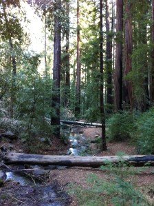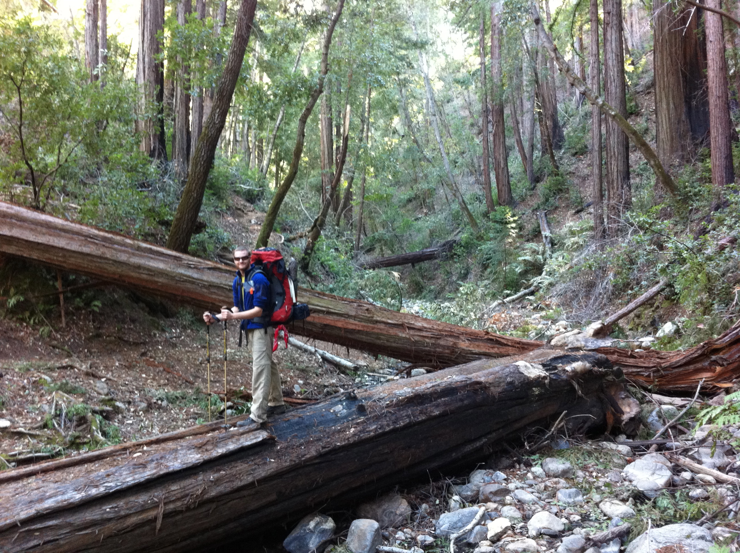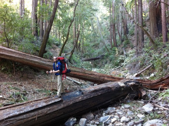 Along the trail, we came across a significant number of downed trees. It was many more than any other trail I had been on, and most looked fairly recent. My guess is that most came down during the strong winds that moved through California at the end of last November. In most cases, downed trees are not much of a problem, but since these were Red Woods, they routinely presented a bit of a challenge… they are after all, very big trees. Eventually, maneuvering over and under the trees became humorous as I occasionally got stuck under them, or Cheyenne’s legs just weren’t quite long enough to easily cross over.