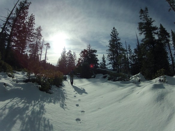Passing the top of Nevada falls marked the end of the significant climbing for the day. The trail flattened out and rolled along another mile to LYV where we would set up camp for the night. This is where the snow began to get deeper and form a consistent cover over the trail. However, there were plenty of tracks leading the way, making travel without snowshoes easy… This continued all the way to LYV where we encountered two other pairs of people that we would be sharing the campground with that night.