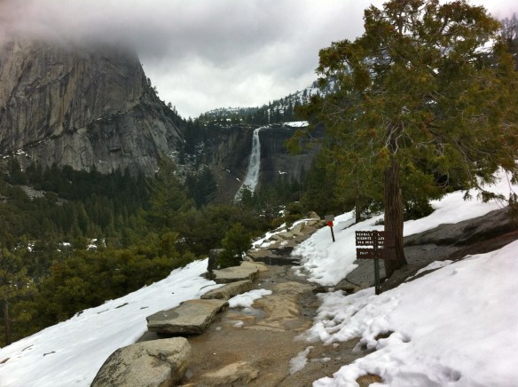 We arrived at the ranger station shortly after 9AM to get our wilderness permit and get some info on trail conditions and weather from the rangers. While the avalanche danger had decreased significantly, more weather was approaching quickly. They were expecting 3-5 inches above 6,000ft on Sunday and another 3-5 Sunday night with the snow line dropping to 4,000ft. Then more rain/snow on Tuesday. As we were talking with the rangers, a guy came in saying he had just come from near the top of Nevada Falls where he encountered foot-deep snow worthy of snowshoes. With this new info we got our permits for the loop with the idea that we would make a final decision on our climb up to Little Yosemite Valley (LYV).
