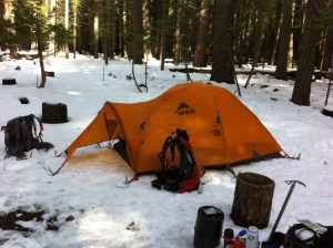We got back to camp at about 5:30PM. A significant amount of snow had melted during the day, and the other camp inhabitants had left. We refilled our water and made dinner… tonight was tuna pasta with alfredo sauce, yummy. As we filled our bellies with a much deserved meal, we reflected on our summit trip, and still felt that we had made the right call in backing off. And after checking the weather, it looked to have been the right call to base camp it at LYV rather than continue on the loop as the weather was beginning to move in. Unsure of what tomorrow would bring, we buttoned up camp, prepped the tent for the possibility of significant snow, and went to bed.