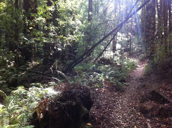 The plan was to do a 28 mile loop through the park over three days, so we headed down early Friday morning. We were on the trail at 8am, starting from the trail head in Sam McDonald Park, and were going about 5 miles to Shaw Flat Trail Camp. The trail meandered through second growth Redwoods and was a mix of single track and fire road, and was well traveled by horses.