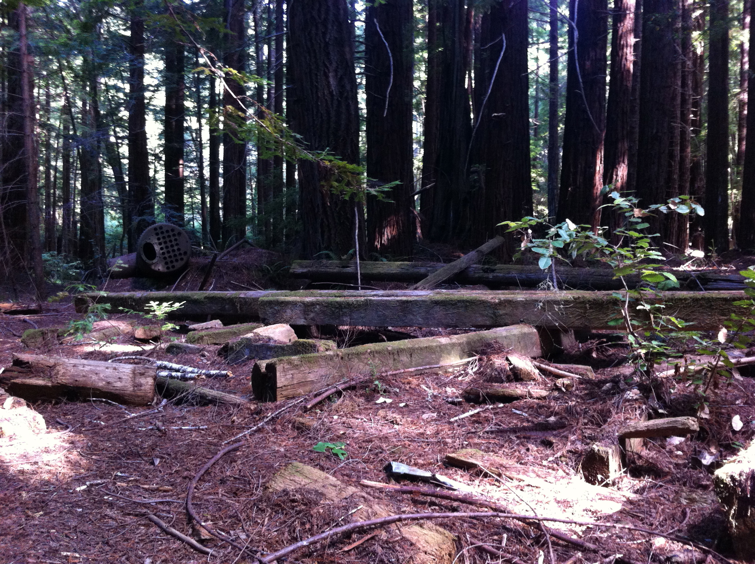 Working our way through the trees we came across the remains of an old shingle mill left behind from the logging days. Not much is left of the mill, other than a few large Redwood beams and an old boiler. One of the long beams was balanced like a teeter-totter so that you can make the whole thing move by standing on one end. Looking at the size of the old stumps, I am amazed that it was even possible to haul those trees to a mill!
