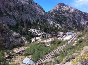 We started up the Rush Creek trail shortly after 8am and immediately began to climb a fairly steep grade. The trail criss-crossed the tracks for a cable tram that went strait up the side of valley to the dams that created Agnew and Gem Lakes. There was no cable on the tracks and I wondered if the tracks we still used.