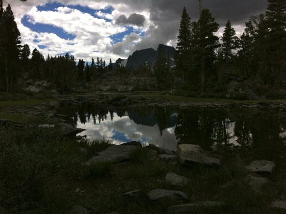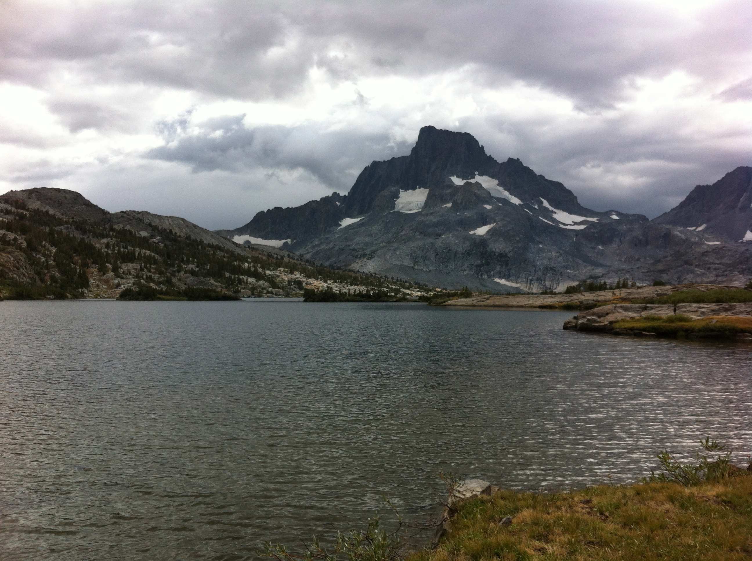 Just past the Clark Lakes we crossed our first pass of the trip at ~9,900ft. From here we got our first look at the reason we had come into the wilderness… Mt Ritter and Banner Peak. They rose high in the sky seeming to punch a hole in the gray clouds above.