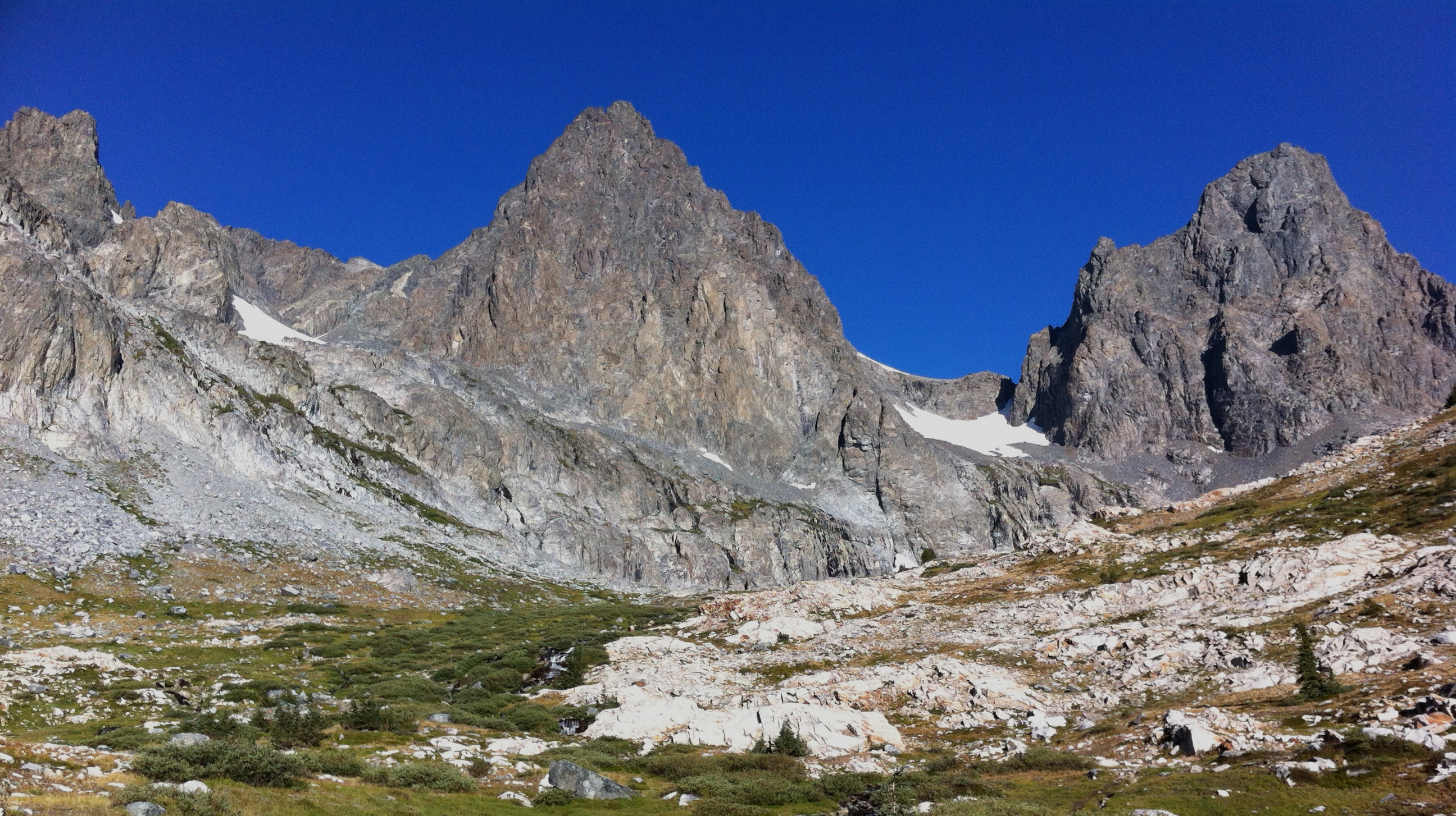 The snow increased in steepness as we approached the base of the chute. Here, at the bottom of the chute, the snow stopped. We looked for a good place to get off the snow, but the chute was filled with very loose rock. I took two steps off the snow and could barely get purchase on the loose rock, sliding back towards the snow. Another step nearly kicked loose a large rock.