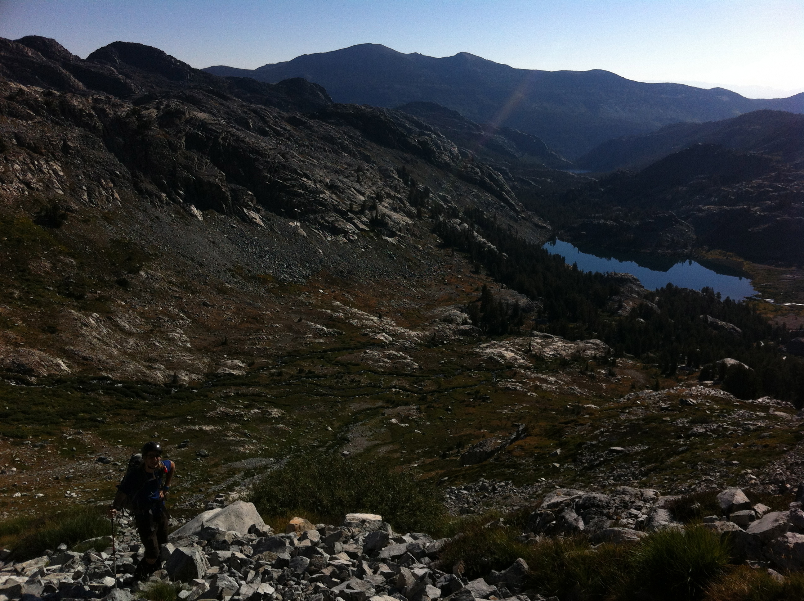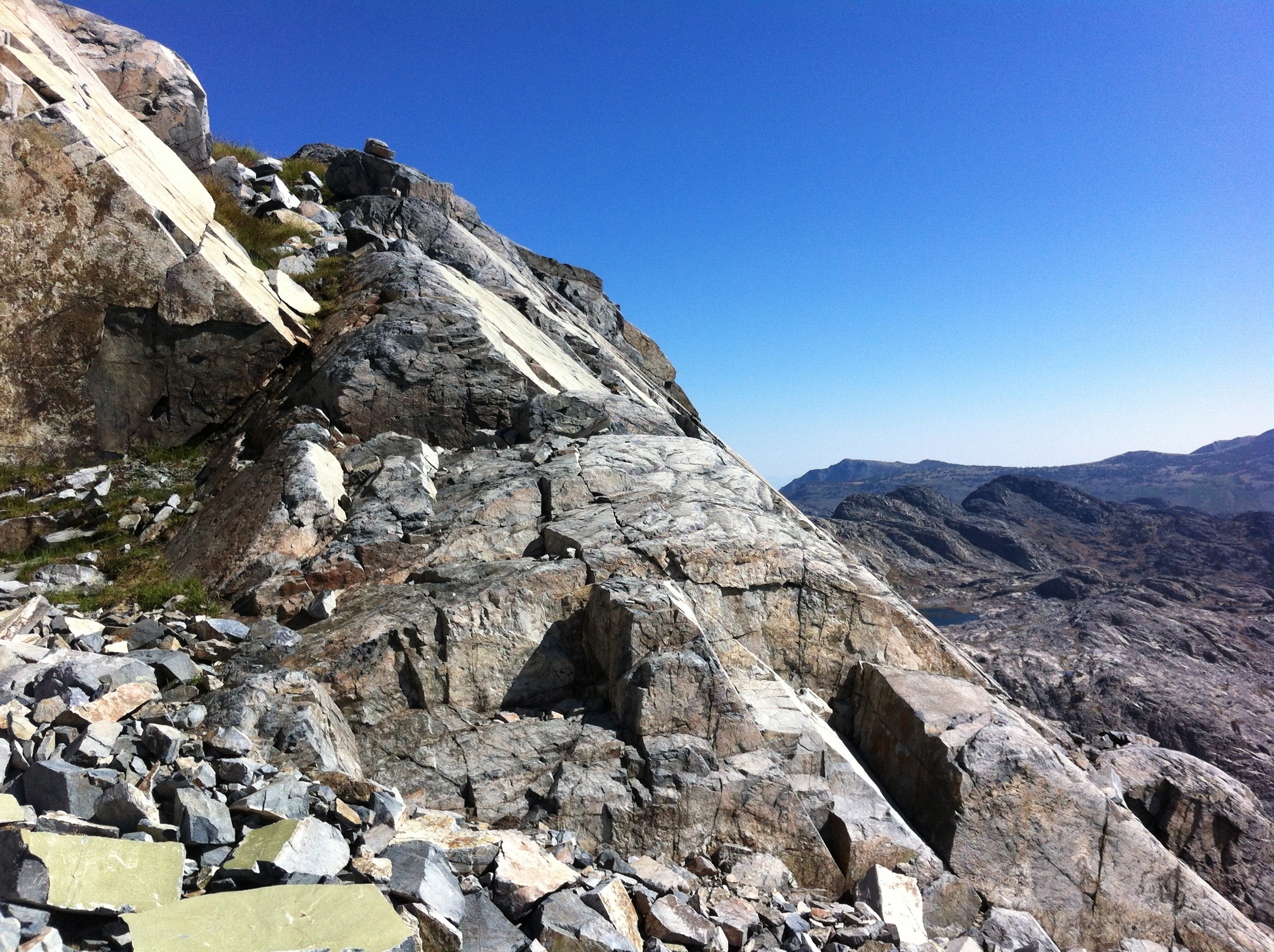 I was feeling good about this descent until we reached the third cairn. We were standing atop a cliff with no apparent way down. The route was supposed to be class 2 the whole way, but we were looking at a whole lot of class 4.
