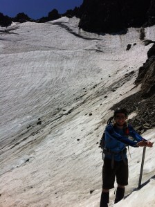The glacier was a light icy blue and covered in dozens of steams flowing down the face. Rock fall had sprinkled the surface with dark boulders of all sizes. Midway up the right side of the glacier were the two chutes that we could take to the summit ridge. From route descriptions, Owens chute sounded like the easier climb, but with the low snow level, there was a significant stretch of wet rock slab that looked very slick. Below Owens chute was Secors chute. Though it is described as being a steeper climb, it wasn’t blocked by streams and slick rock.