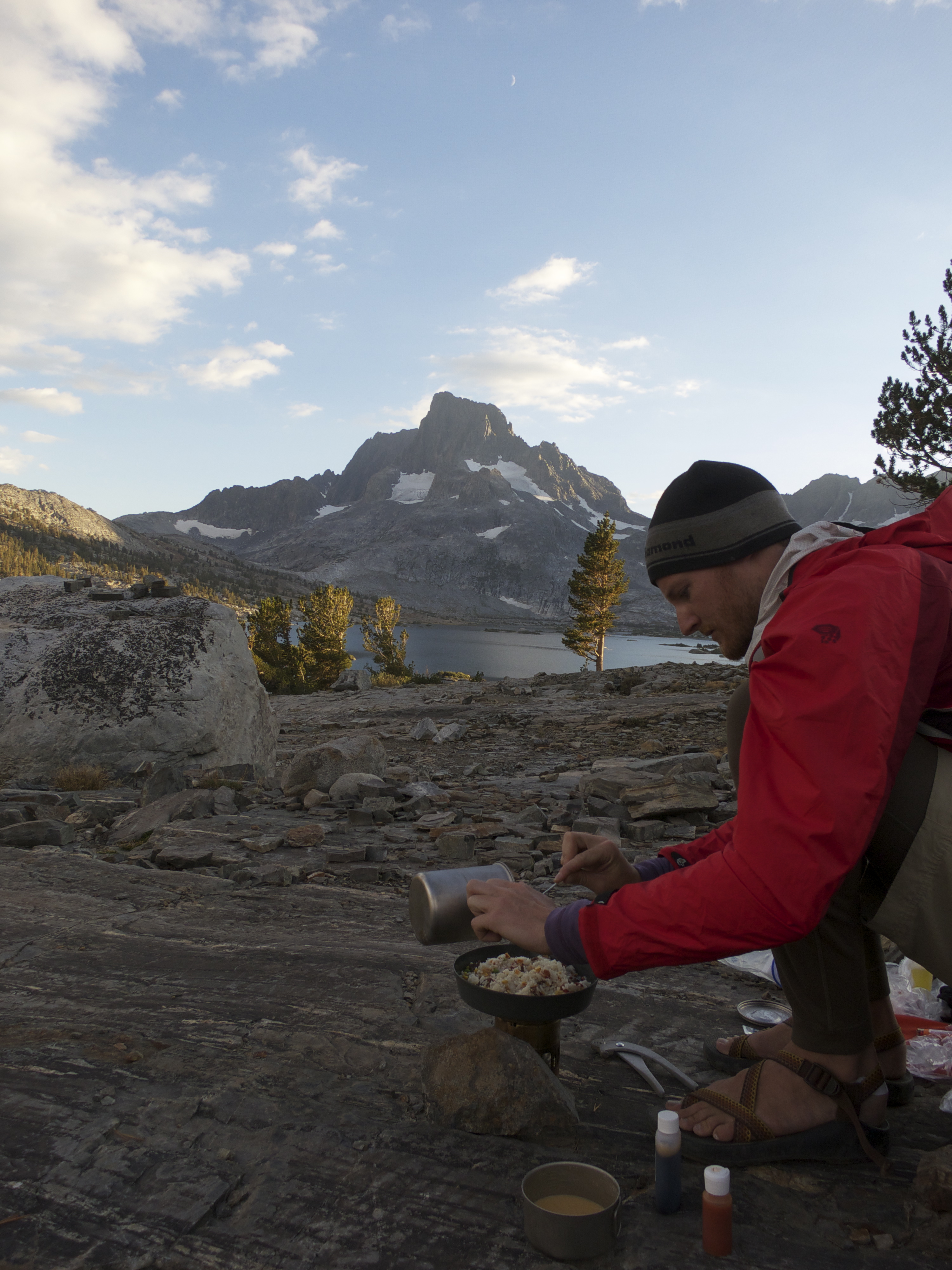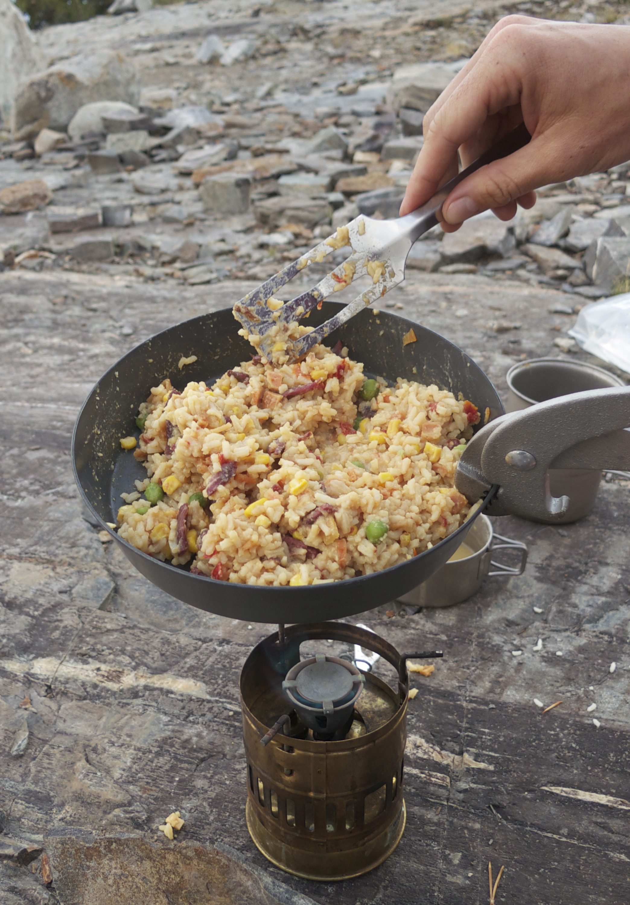 At Home: Combine rice and veggies in plastic bag. Put egg serving in separate bag (adding a small amount of powdered milk to the egg can improve flavor in the back country).Make the meal easy to retrieve from the bear canister by keeping egg bag in the rice/veggie bag.