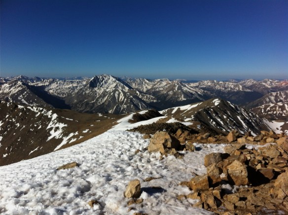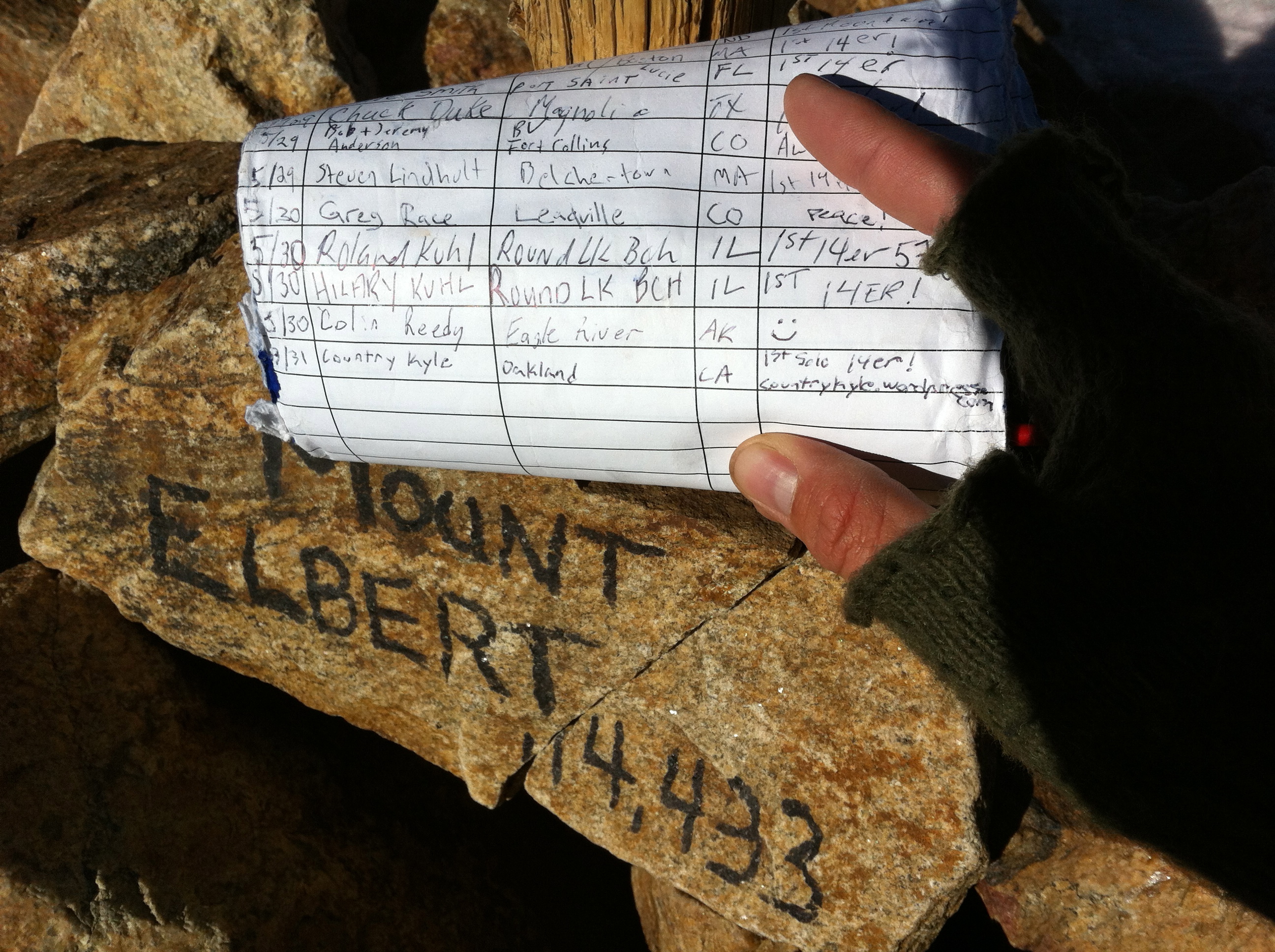 I made the summit at 8am… 1st one up of the day, the tallest mountain I’ve ever climbed, and my 1st solo 14er! The view was amazing! I sat down for a bit to eat and sign the summit register. It was cold, but the wind had died down, so it was easy to enjoy the summit.