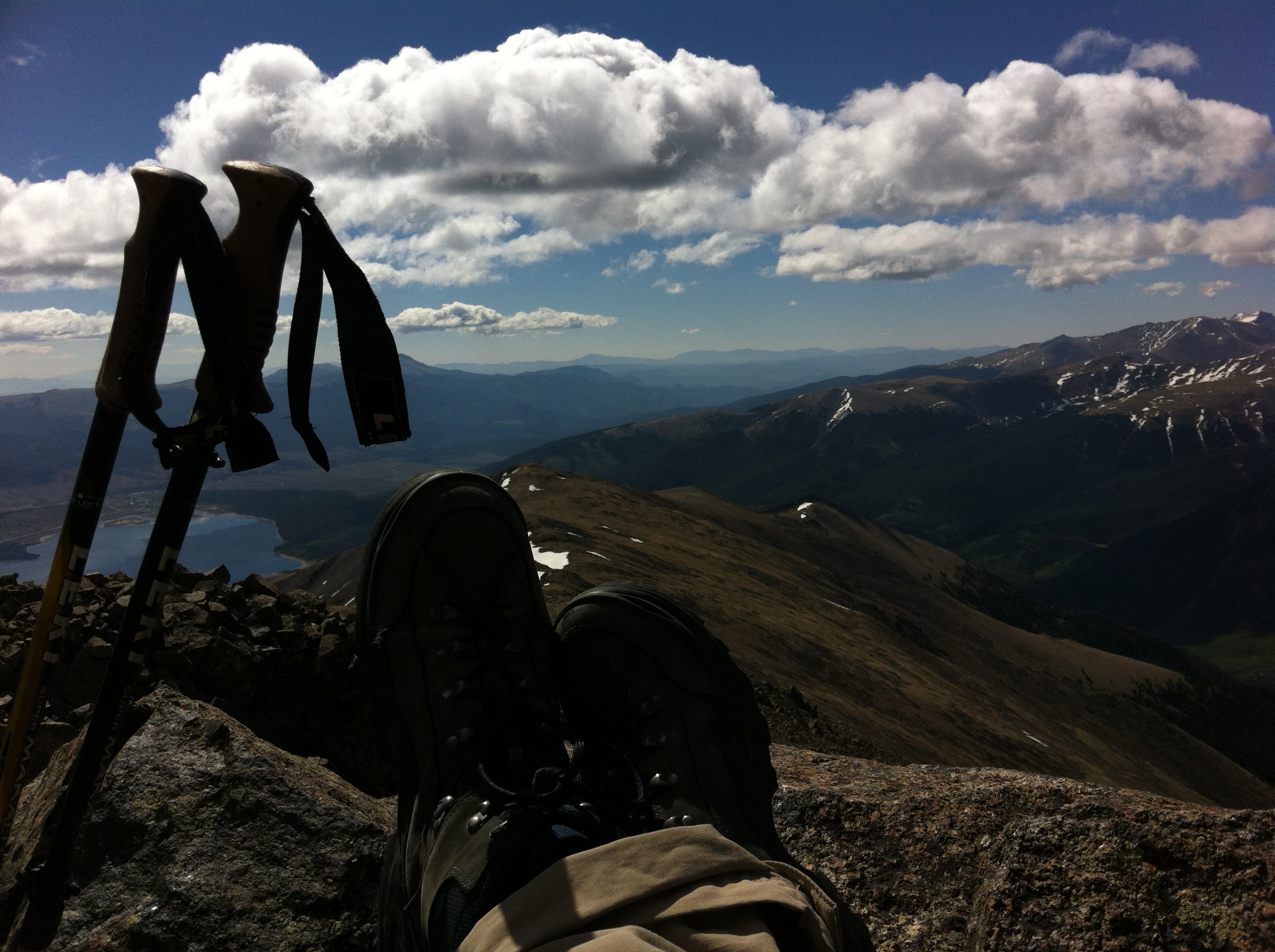 When I reached the top of South Elbert (Mt Elbert’s sister peak), I stumbled upon a geocash and decided this would be a good place for a break. From here I had a great view into the green valley below, and some fluffy clouds began moving in. As I sat there, I saw two figures moving up the ridge towards me. We met up and chatted for a bit, snapped a few pictures and went our separate ways.