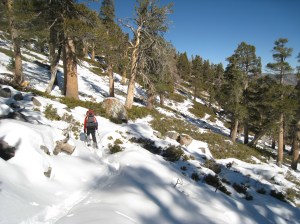 About halfway down the trail, we rounded a corner and came up on a set of foot prints in what remained of the snow. We were no longer going to be putting in first tracks. Though we had yet to find a person to go with those tracks, I was suddenly reminded that we were in fact on a fairly well traveled trail and no longer felt so removed from civilization. After a bit further, we came up on Richard. He was a volunteer park ranger (as many rangers in CA are now due to budget cuts) out on a day hike towards Dollar Lake. He told us stories of people he runs into with tennis shoes and a single bottle of water with the idea that they would make it to the summit and back in the snow. We had a few laughs about this, then showed him our permit and continued on. A little while later I hear Paul laugh behind me… I look back and he says, “You know what I just realized? We just met Ranger Rick!” HA!