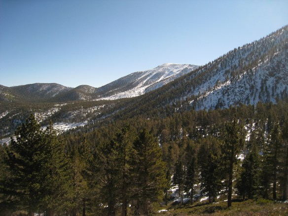 It was 11AM by the time we had camp packed up and were ready to take off down the mountain. The start of the trail was in the shadow of the ridge and had a strong wind blowing up the slope… and with out previous tracks we again found ourselves post-holing through knee-deep snow. Today, however, this didn’t last long. The snow level decreased and the temperature increased quickly as we descended.